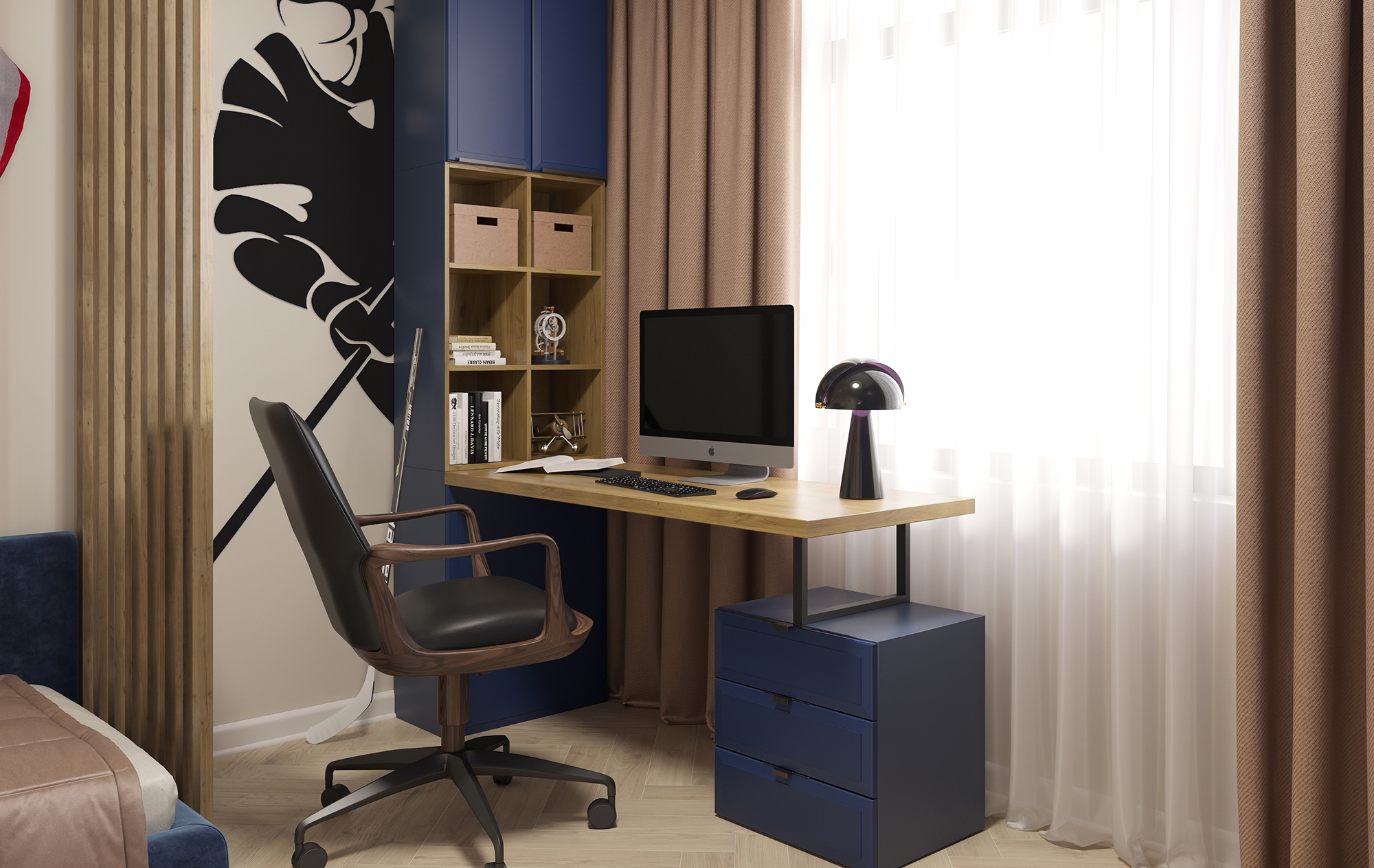 Стеллаж — корпус в деревянном декоре с тёплой текстурой и синие фасады — сочетают уют и свежий акцент. Полки показывают то, что вдохновляет: книги, гаджеты, трофеи. Просто, стильно, по-взрослому — но с оттенком юности.