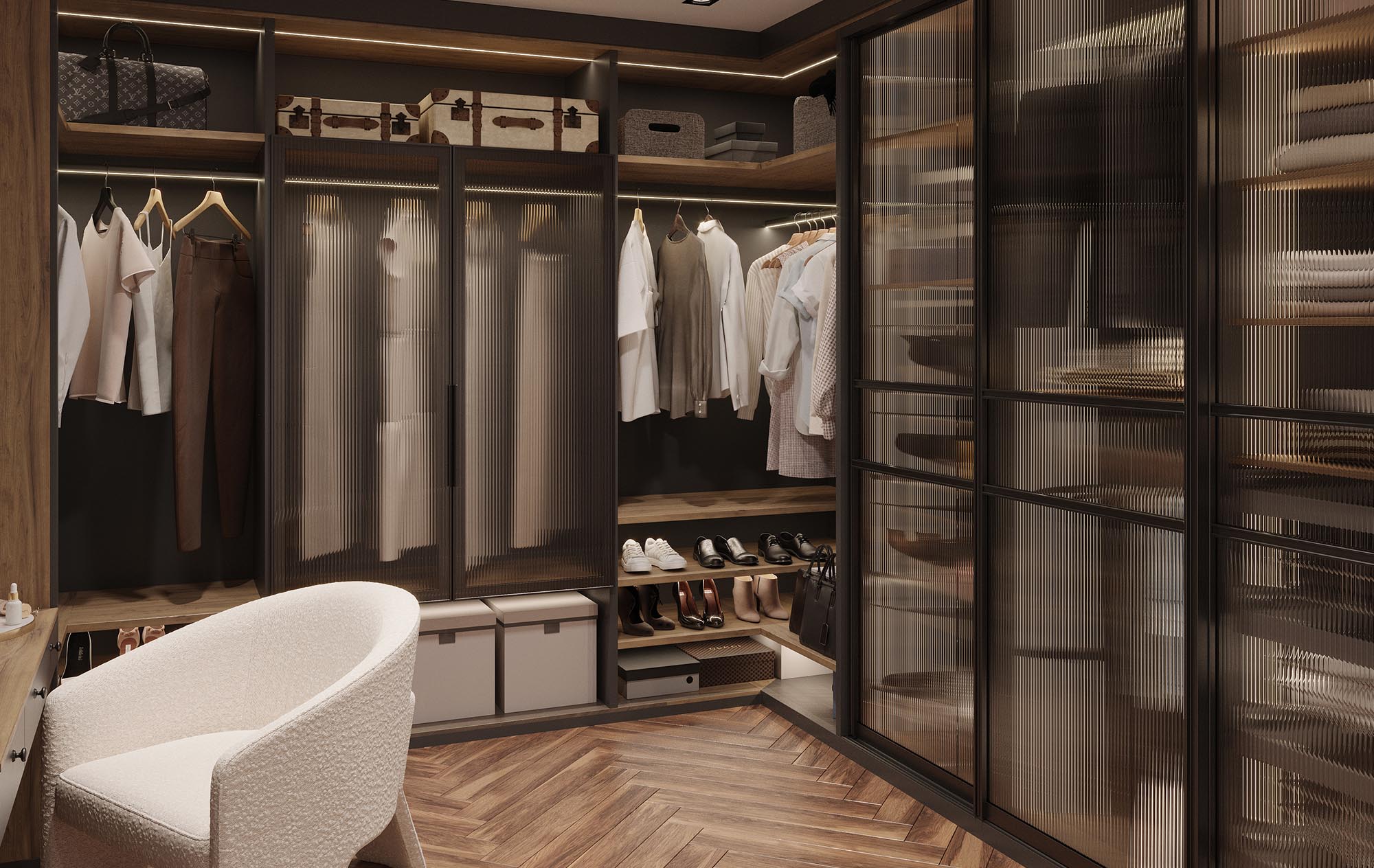 Все элементы дополнены встроенной подсветкой, которая создаёт комфортное освещение и подчёркивает детали. Благодаря этому, поиск нужной вещи становится лёгким и приятным, а сама гардеробная — не просто зоной хранения, но и частью вашего уюта.