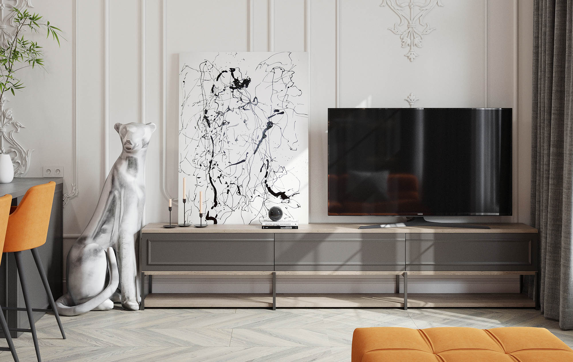 ТВ тумба в стиле неоклассики — гармония линий и изысканная симметрия.