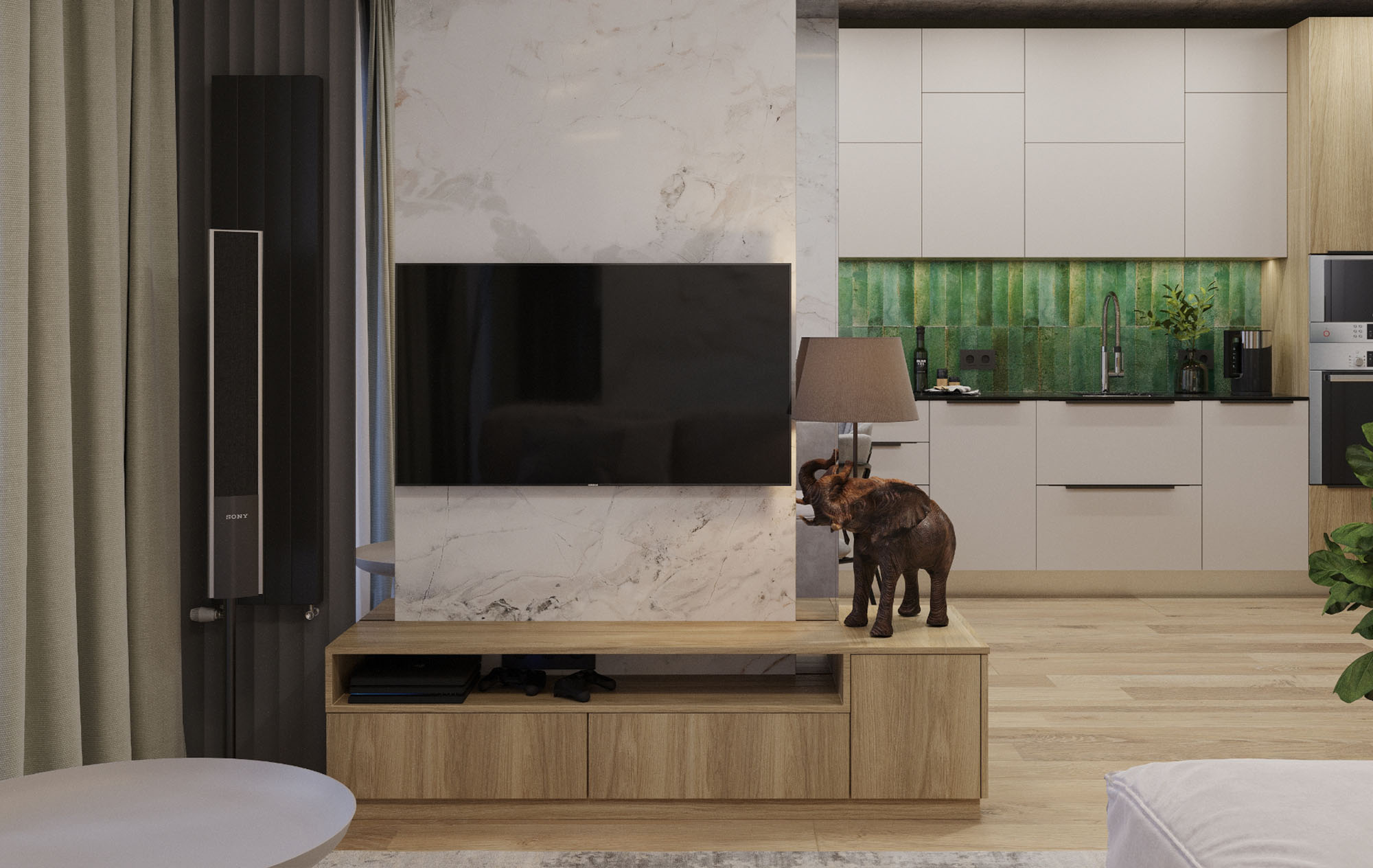 Эта тумба — практичное и стильное решение для гостиной в современном интерьере. Изготовленная из ЛДСП, она сочетает доступную стоимость и надёжность. Её особенность — форма, которая огибает торец стены, плавно соединяя зону гостиной и кухни. Такой подход помогает визуально объединить пространство, сделать его более целостным и удобным.