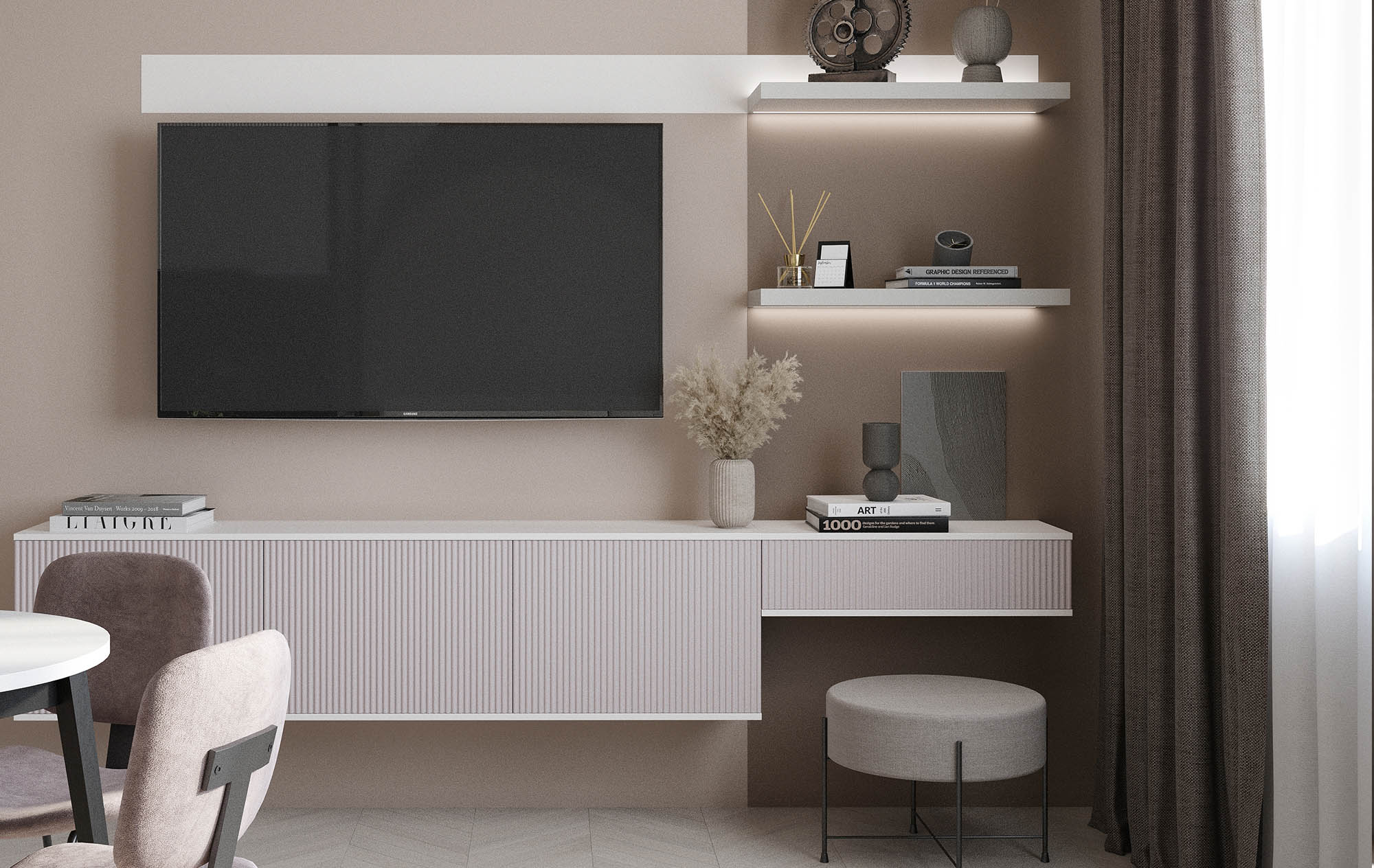 Эта гостиная объединяет зону отдыха и зону работы в одном гармоничном пространстве. В её состав входит подвесная тумба под ТВ, небольшое рабочее место и полки над ним — всё выполнено в едином стиле, что создаёт ощущение целостности и продуманности интерьера.