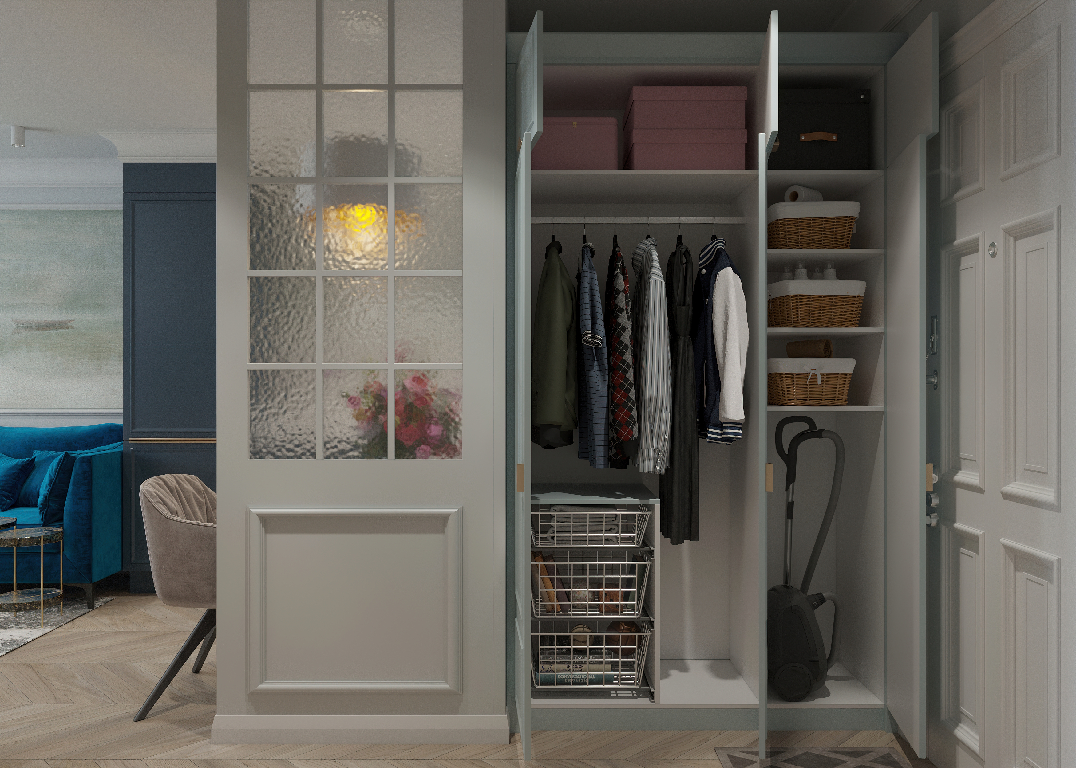 Внутри прихожей предусмотрено всё необходимое для комфортной жизни: место для хранения одежды, чтобы вещи всегда были ухоженными и под рукой; специальная ниша для пылесоса, чтобы он не занимал лишнего пространства и не портил эстетику; а также корзина для мелких вещей, где можно хранить ключи, зонтики, сумки и другие аксессуары. Всё это вписано в общую композицию так, чтобы не нарушать гармонию.